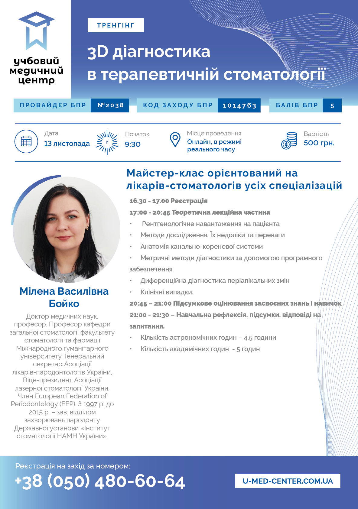 Освіта2013-2018 роки ПВНЗ Київський медичний університет Лікувальна справа2018-2019 роки Національний медичний університет охорони здоров’я України імені. П.Л. ШупикаІнтернатура за спеціальністю «Судово-медична експертиза»2019-2021 роки ПВНЗ Київський медичний університетІнтернатура за спеціальністю «Радіологія»2021 рік Національний медичний університет охорони здоров’я України імені. П.Л. ШупикаСпеціалізація «Рентгенологія»2021 рік Українська військово-медична академія Спеціалізація «Організація і управління охороною здоров’я»РоботаЗ 2017 року до тепер лікар-рентгенолог щелепно-лицевої діагностики INSIDDEN 3D. З 2014-2017 роки під час навчання працювала в стоматології Медстом, асистент-стоматолога. Професійні навичкиОписи КПКТ-досліджень голови та шиї, ОПТГ, ТРГ.Робота на апаратах Planmeca ProMax MID, Planmeca ProMax ClassicНавчання лаборантів роботі на апаратах PlanmecaНавчання лікарів, інтернів та студентів роботі в програмі, практичне використання знімків у стоматології.