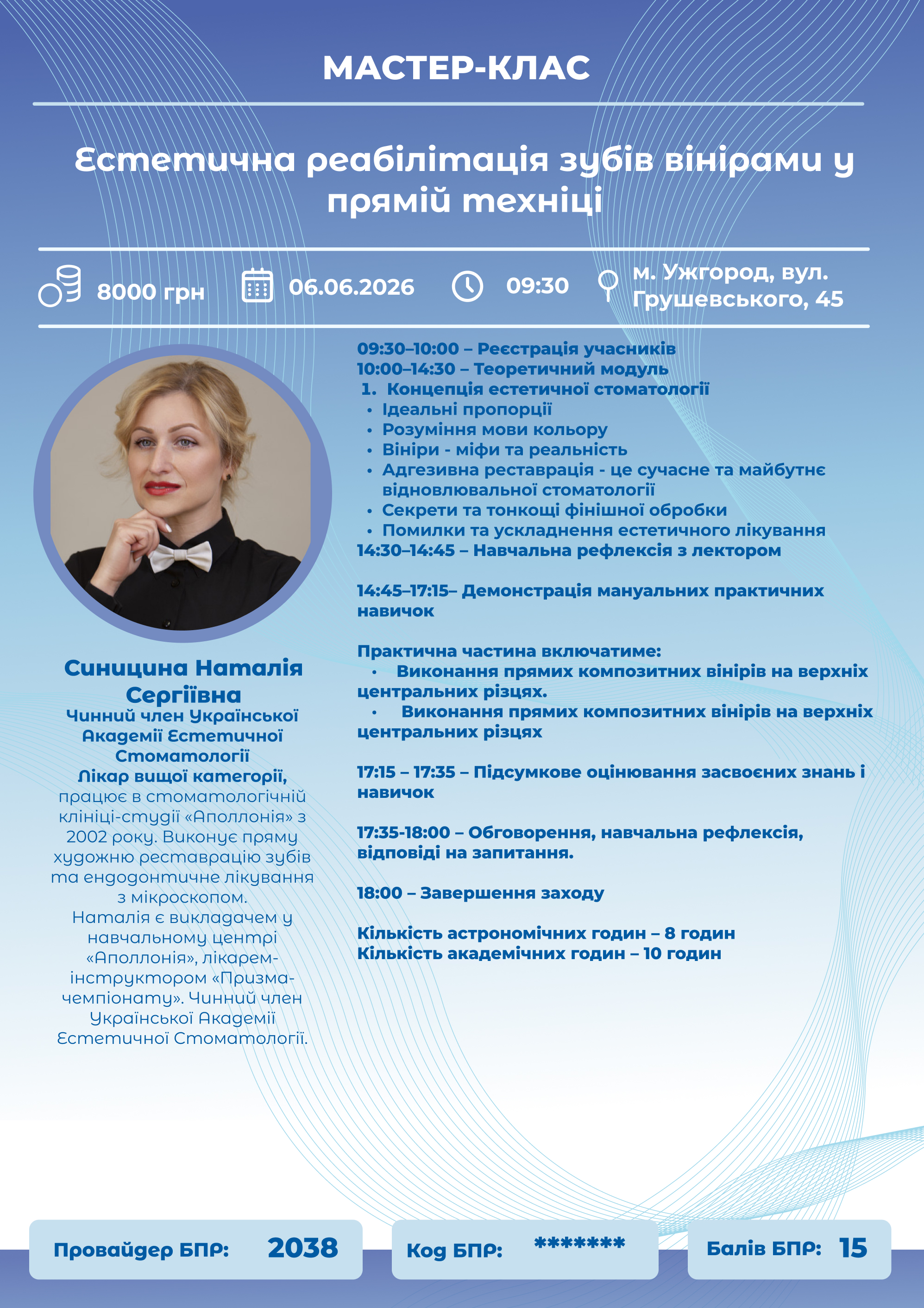 - Виконання прямих композитних вінірів на верхніх центральних різцях